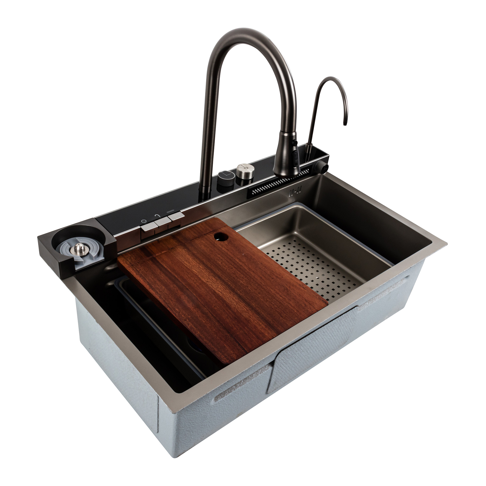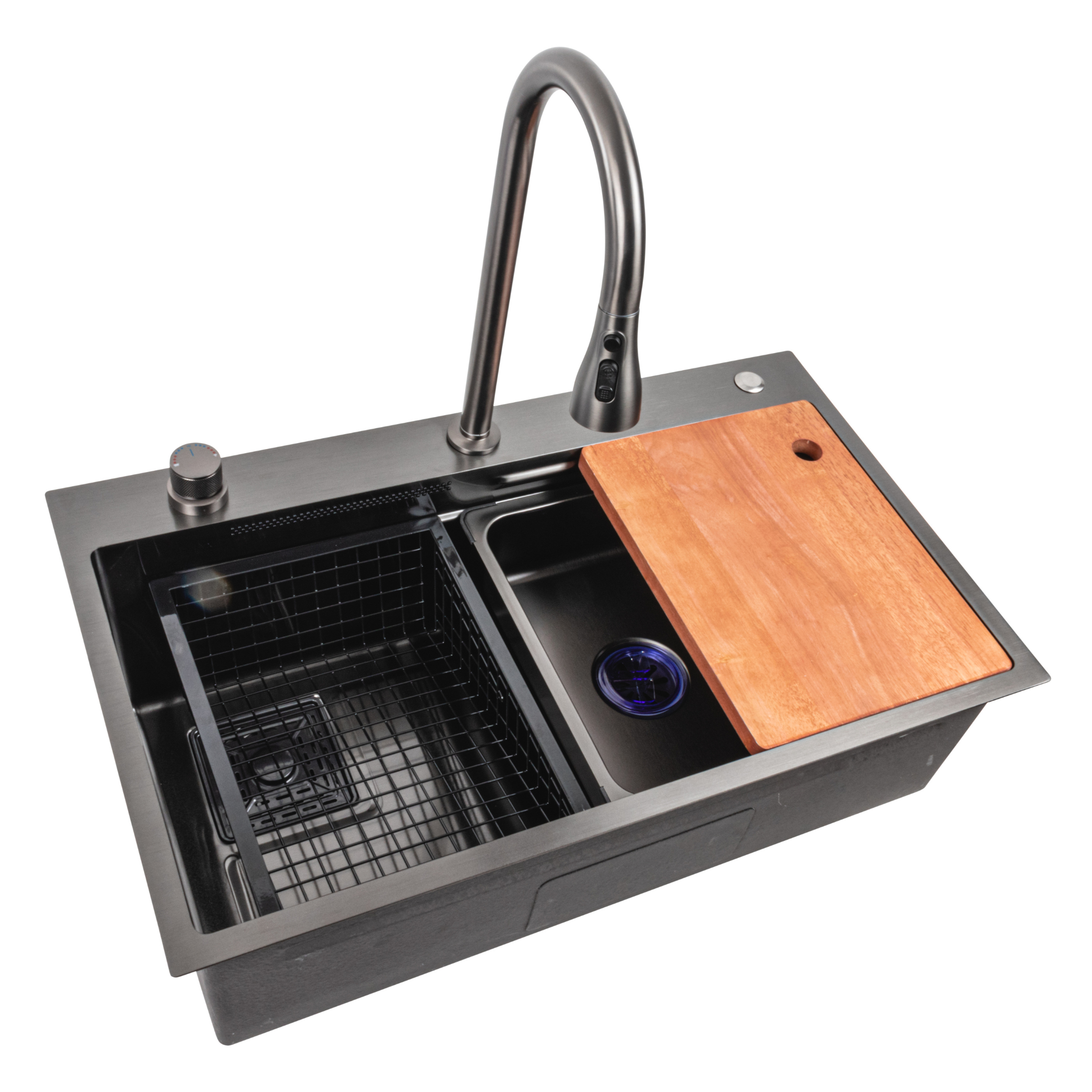 Эти модели отличаются серой цветовой гаммой и черной цветовой гаммой высококачественными материалами нержавеющей стали SUS 201 изготовления. Смеситель с выдвижным душем и режимом водопада обеспечивает комфорт при мытье продуктов и посуды. Также в комплекте есть разделочная доска и лоток для размораживания и мытья продуктов.