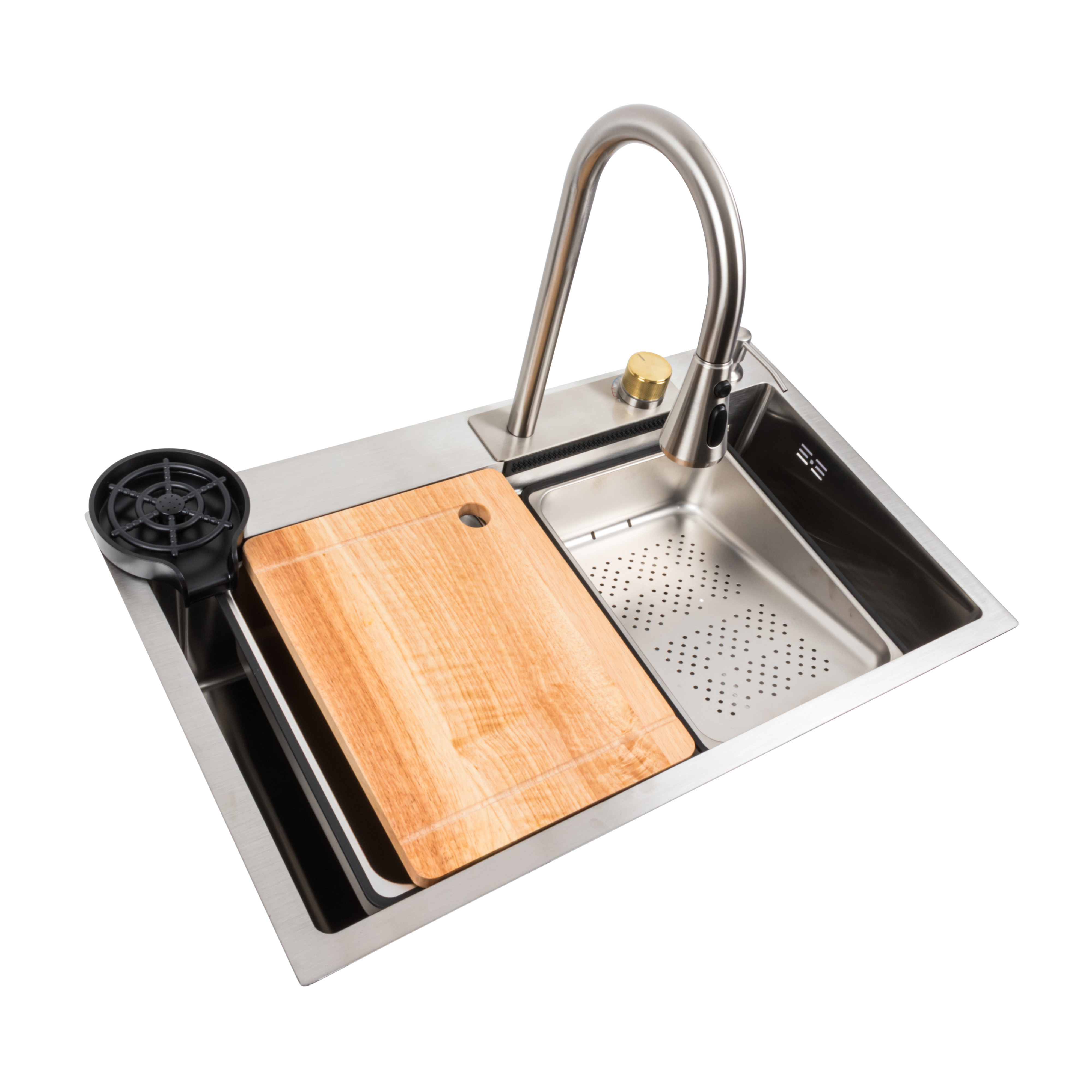 Другая популярная модель этой линейки, поражающая функциональностью и стилистическим дизайном. Также оснащена выдвижным смесителем, удобным режимом водопада и изготовлена из высококачественной нержавеющей стали с покрытием PVD. Закругленные углы и уклон дна облегчают использование. Кроме того, мойка имеет встроенный ринзер для мытья стаканов.