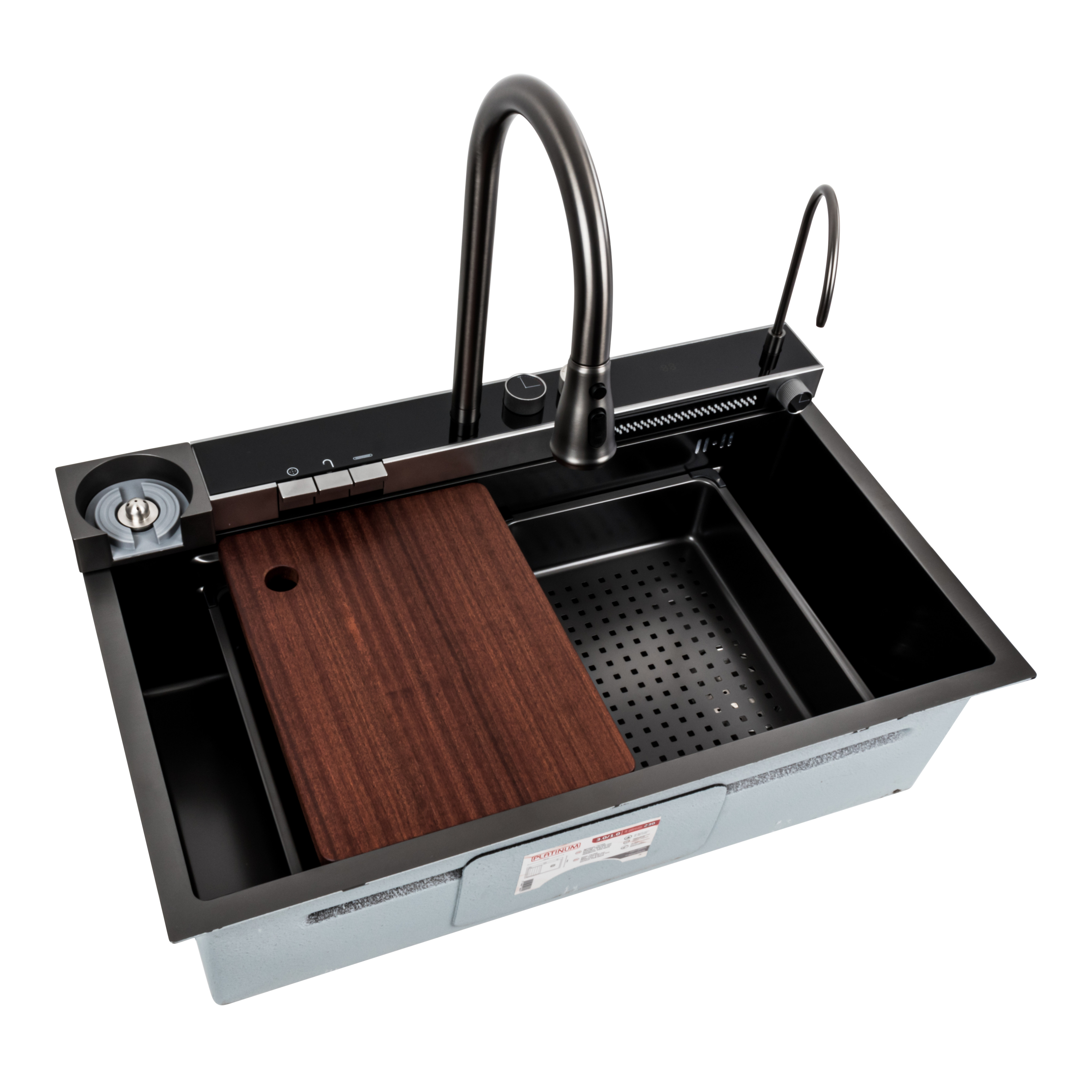 Встроенная мойка имеет стильный черный цвет, а смеситель с гибким изливом и двухуровневым ступенчатым дизайном может быть перемещен вправо или влево внутри мойки, что позволяет экономить воду, время и усилия. Глубокая и просторная раковина позволяет разместить кастрюли без брызг и легко справиться с мытьем столовых приборов.