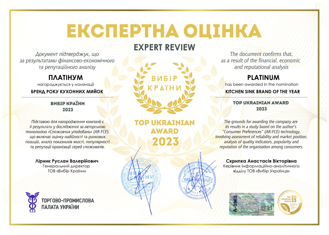 Наша компания с большим удовольствием выражает искреннюю благодарность каждому из Вас. Наши совместные усилия привели к достижению высоких результатов: с гордостью представляем Вам нашу самую важную награду - "ВЫБОР ГОДА" от Торгово-промышленной палаты Украины и Аналитического центра "Выбор Украины"! Это огромное достижение, которое стало возможным благодаря Вашей невероятной поддержке и вере в нас.