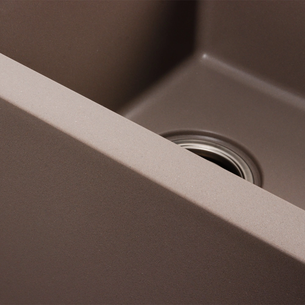 Мойка на 80% состоит из кварца и на 20% из очень жесткой акриловой смолы, благодаря чему неприхотлива в уходе, а также имеет большой запас прочности.