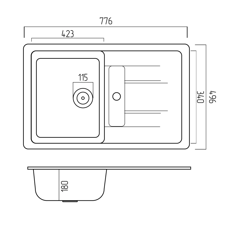 Размеры мойки – 776х496х180 мм, вес – 13,2 кг, сифон - евросифон с широкой горловиной, 110 мм.