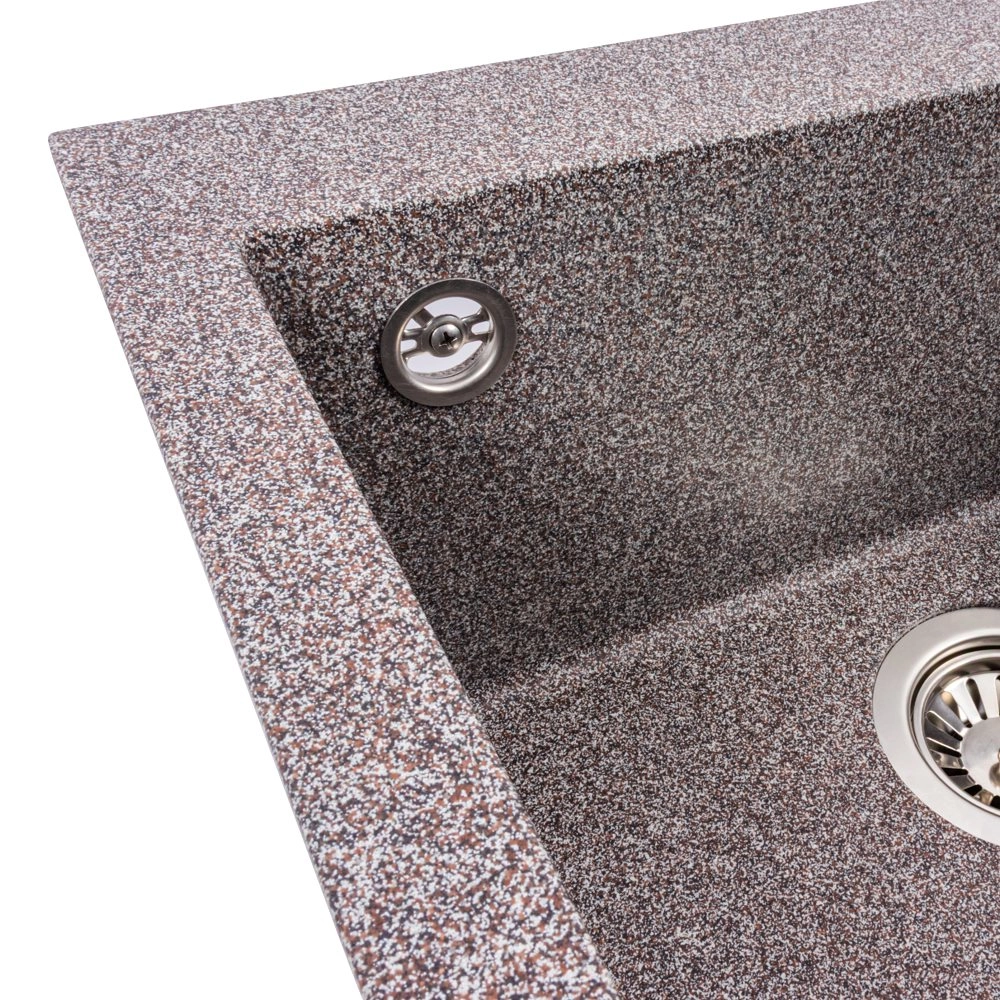 Компактный размер 500×500 мм и глубокая чаша 200 мм обеспечивают комфорт в повседневном использовании даже на небольшой кухне. Мойка изготовлена из прочного искусственного камня на основе гранитной крошки, устойчива к повреждениям, высоким температурам и бытовой химии.