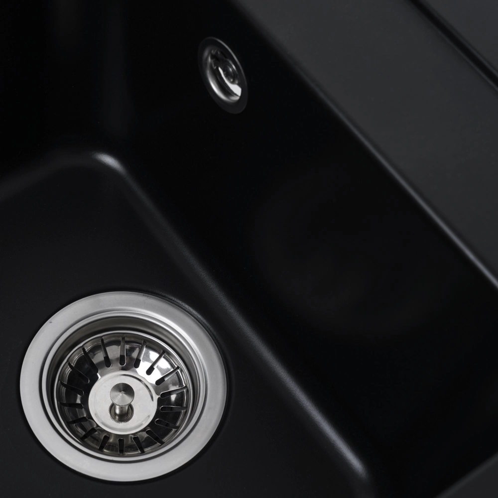 Мойка имеет матовую фактуру и приятный для глаза цвет - черный, что позволяет ей легко вписаться в интерьер кухни.