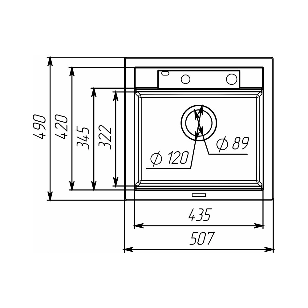 Несмотря на компактные внешние размеры мойки 510×490×200 мм (ШхГхВ), основная чаша является достаточно вместительной — 440×349×200 мм (ШхГхВ), обеспечивая комфорт для ежедневных кухонных задач.