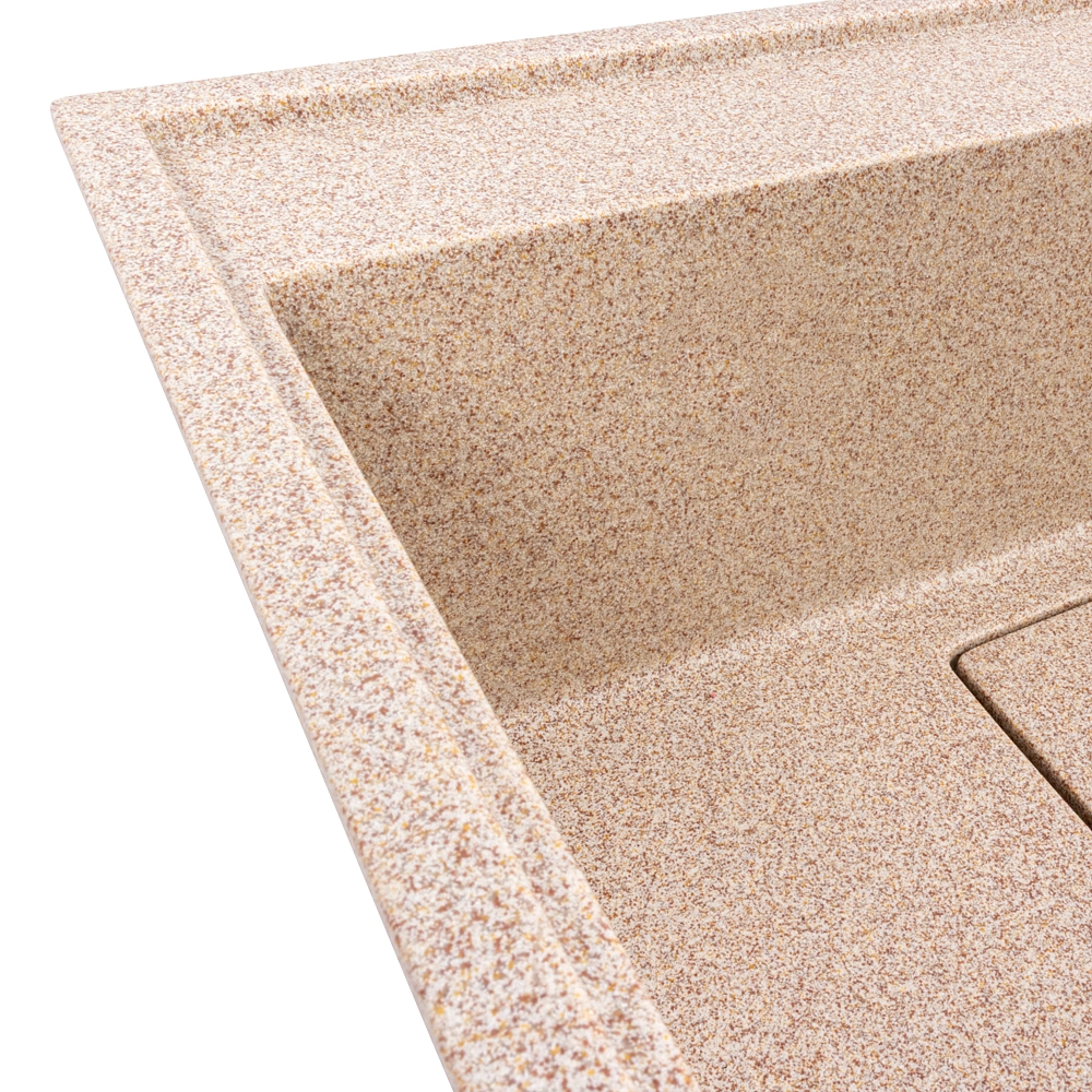 Гранитная кухонная мойка VALESO 6050 SHERLIT в цвете карамель — это современное и долговечное решение, которое добавит тепла и уюта вашей кухне. Ее матовая поверхность, нежный оттенок и продуманный дизайн с одной основной чашей без сушки обеспечивают функциональность и эстетический вид.