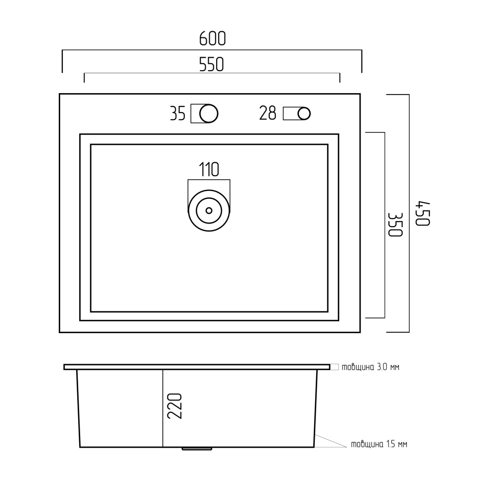 Мойка имеет чашу глубиной 220 мм, что обеспечивает удобство ежедневного использования. Тип установки – универсален, как на столешницу, так и под столешницу. Для монтажа мойки требуется ширина столешницы не менее 500 мм.