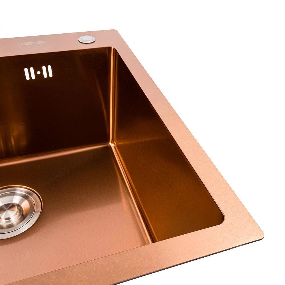 Кухонная мойка Platinum Handmade 50*50 (500x500x229 мм) PVD медная это отличное стильное решение для кухни небольших размеров. Лаконичный дизайн прямоугольной формы хорошо подходит разным интерьерам кухни.