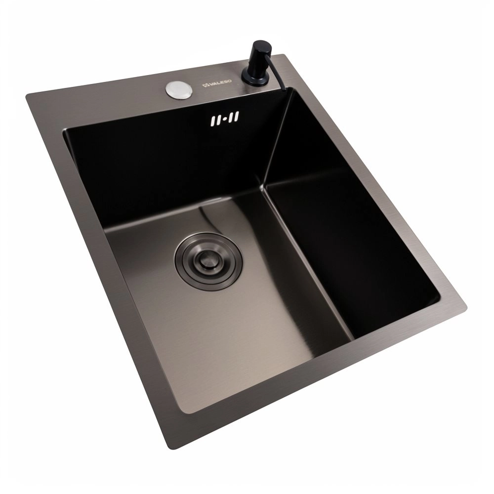 Кухонная мойка PVD черная 40*50 VALESO Handmade (сифон круглый 3,0/0,8) – это отличное стильное решение для кухни небольших размеров (400x500x230). Лаконичный дизайн формы хорошо подходит разным интерьерам кухни.
