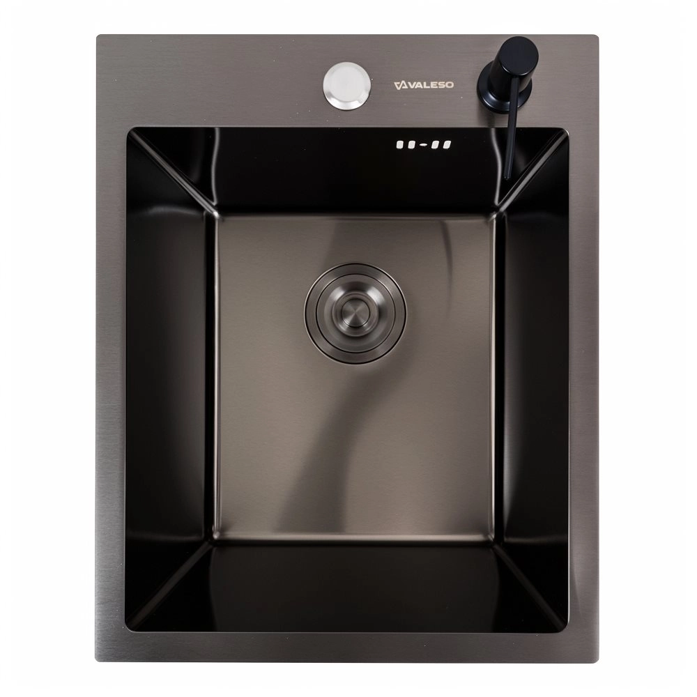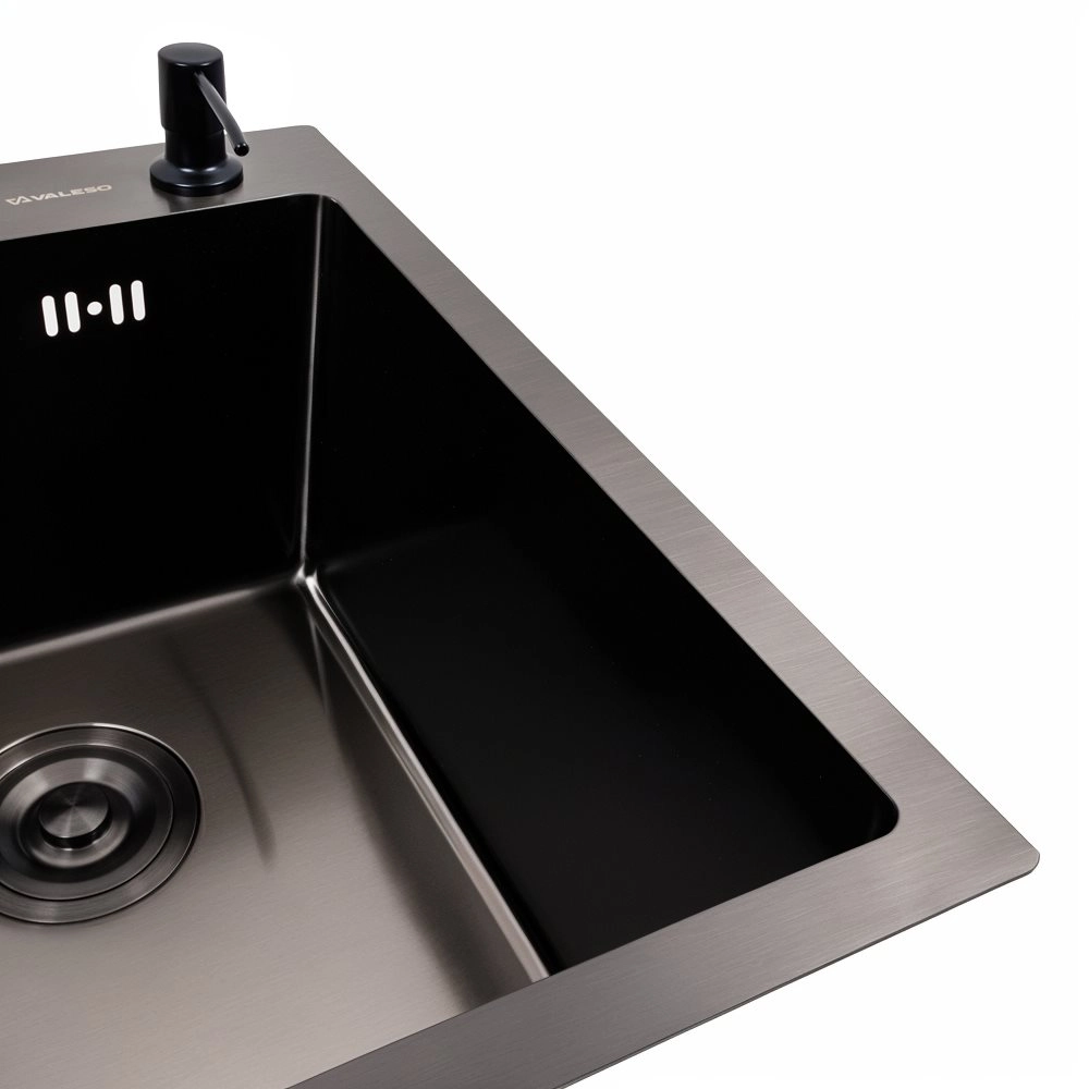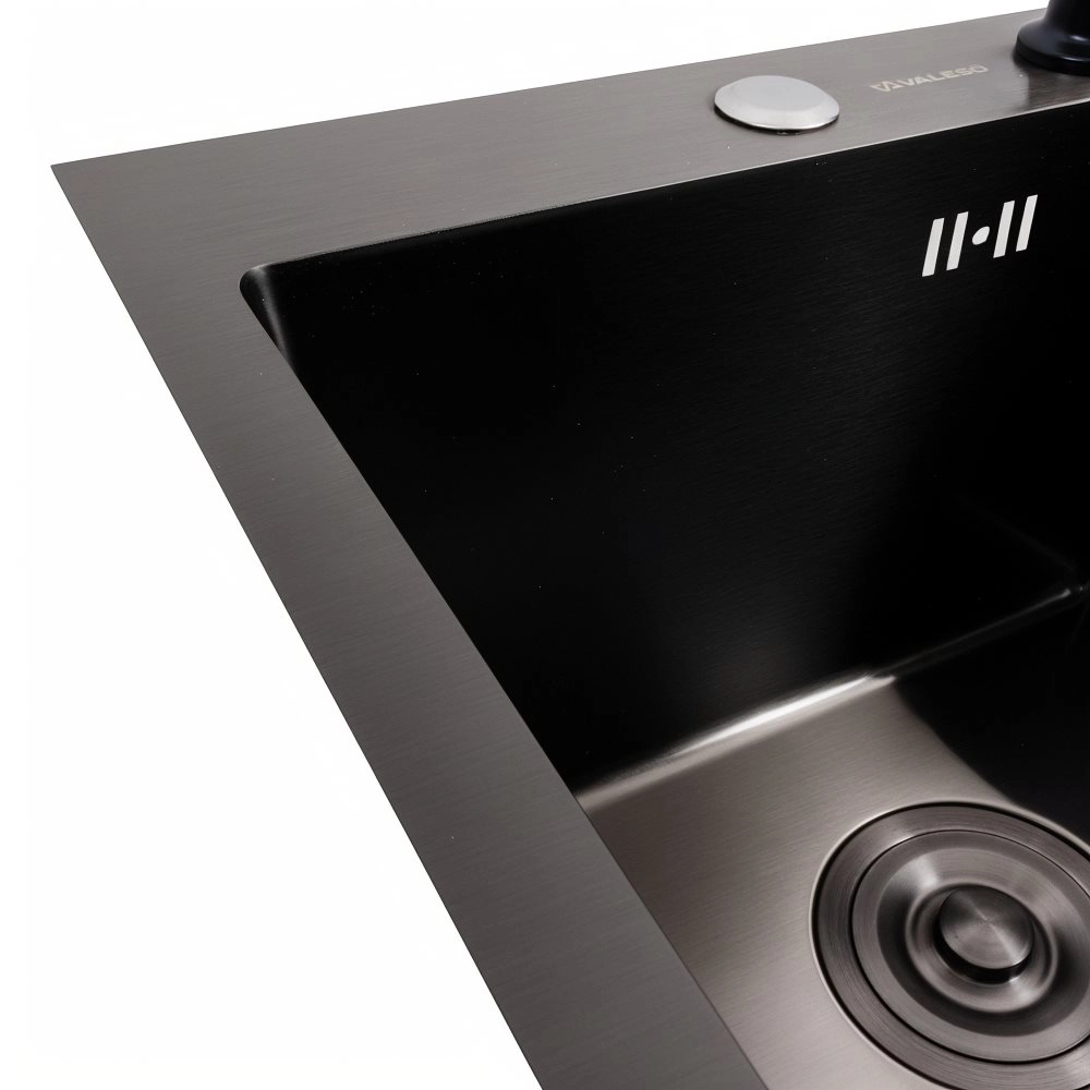 Мойка для кухни черная VALESO изготовлена из нержавеющей стали SUS 201 с PVD покрытием толщиной 3.0/0.8, что гарантирует ее долговечность. Покрытие PVD мойки защищает ее от царапин потемнения и налета. Такая кухонная мойка не опасается высоких температур и влияния средств бытовой химии.