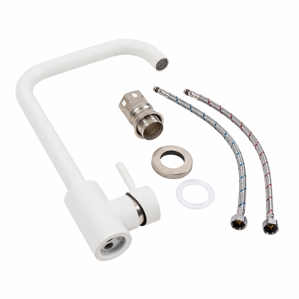 Изготовлен смеситель из высококачественной нержавеющей стали SUS304, которая славится своей прочностью и стойкостью к коррозии. Это качественное материальное основание гарантирует длительную службу смесителя и его надежность. Цвет смесителя- белый.