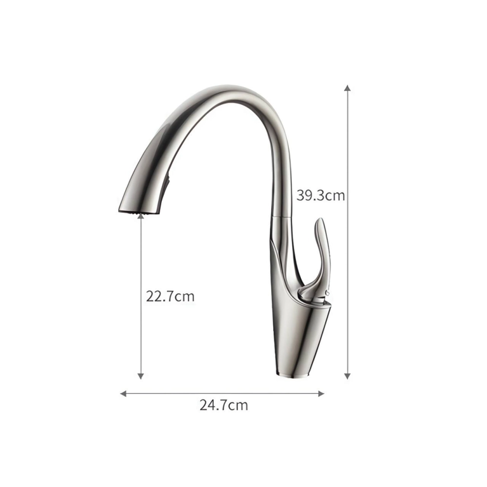 Габариты: Высота смесителя составляет 430 мм, высота от основания до носика — 247 мм, а длина излива — 227 мм.