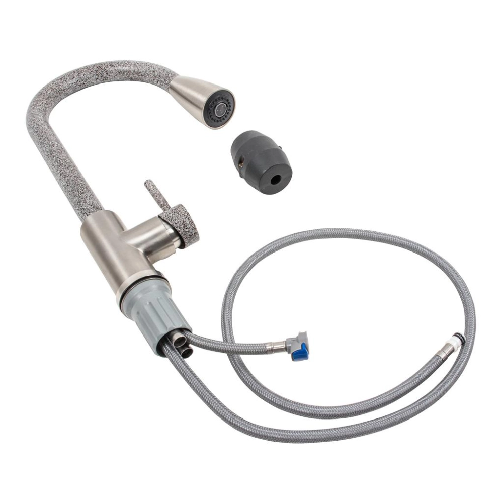 Длина излива может изменяться, что позволяет вам подстроить смеситель под ваши потребности. Комплектация включает надежное крепление, обеспечивающее стойкость смесителя, а также гирьку для излива, которая помогает регулировать струи воды.
